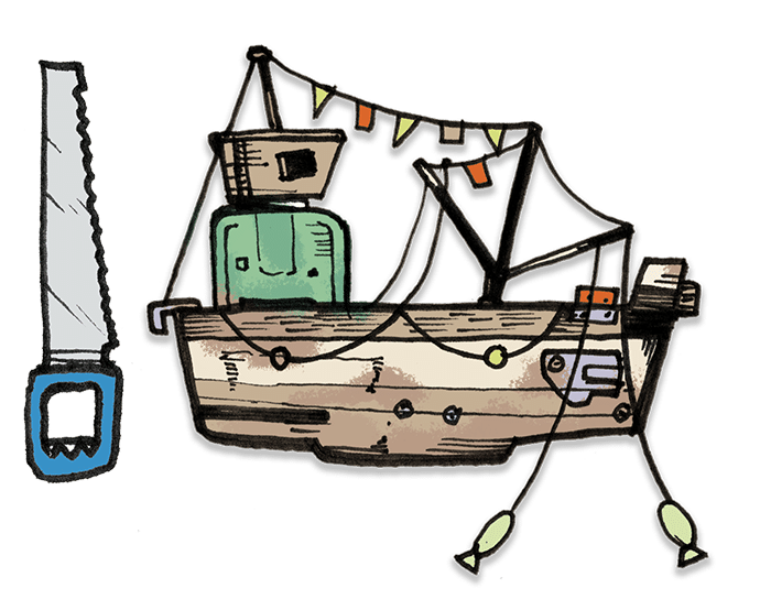 Leerlingen worden uitgedaagd om op creatieve wijze gebruik te maken van oude scharnieren, schroeven, touw, etc. om details zoals de romp, reling en andere elementen te maken.